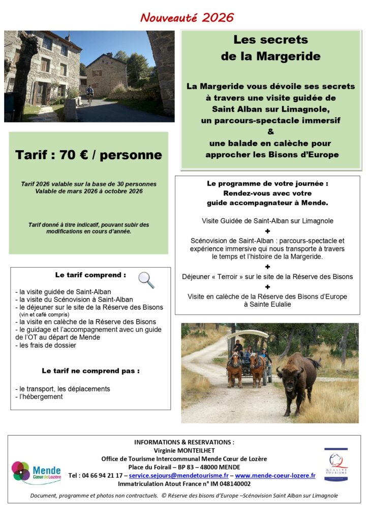 Après avoir exploré le Parc des Loups du Gévaudan ou la Réserve des Bisons d’Europe, prolongez votre découverte de la Margeride avec une expérience unique au Scénovision de Saint-Alban. Conservez simplement votre ticket d’entrée de l’un de nos parcs et profitez d’une réduction exclusive au Scénovision ! Le Scénovision vous propose un parcours-spectacle captivant de […]